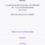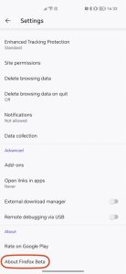 - به پایین صفحه بروید و در قسمت About رفته و روی About Firefox Beta کلیک کنید.