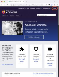 - برای ورود به سایت mozilla.org، روی میانبر log in در گوشه بالا و سمت راست صفحه کلیک کنید.