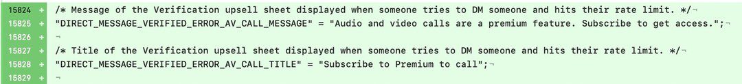 علاوه بر این، کریس در ادامه بخشی از کد را نشان میدهد که به طور خاص به این موضوع اشاره دارد که “تماسهای صوتی و تصویری ویژگیهای پرمیوم هستند” و کاربران باید “اشتراک خریداری کنند تا به آن دسترسی داشته باشند”. اینکه تنها به عنوان یک کاربر پرمیوم میتوانید تماسها را شروع کنید، یا اینکه برای دریافت آنها نیز باید مشترک باشید، هنوز روشن نیست.