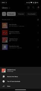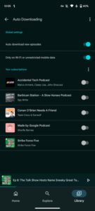 دانلود خودکار بر اساس هر برنامه و هر دستگاه عمل میکند، بنابراین باید به صورت جداگانه فعال شود. گوگل پادکست صفحهای اختصاصی برای دانلود خودکار را ارائه میدهد تا بتوانید به سرعت دانلودها را روشن/خاموش کنید. در YouTube Music، معادل تقریبی آن این است به Library tab > Podcasts filter > Downloaded بروید و با استفاده از منوهای جانبی هر برنامه، مدیریت دانلودها را انجام دهید.