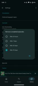 در حال حاضر، تنظیمی برای حذف خودکار وجود ندارد که در سایر برنامهها رایج است. به عنوان مثال، گوگل پادکست یک تنظیمات “Remove completed episodes” دارد که به شما امکان میدهد پس از 24 ساعت، 7 روز، 30 روز و 90 روز بازه زمانی را مشخص کنید. این برنامه همچنین کنترل “حذف قسمتهای ناتمام” را نیز ارائه میدهد.