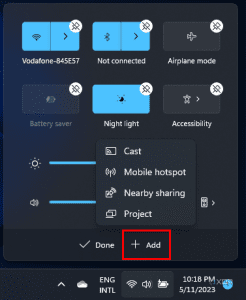 - برای اضافه کردن یک quick actionجدید، روی دکمه Add کلیک کرده و سپس از گزینههای موجود انتخاب کنید. این گزینهها شامل Cast، Mobile hotspot، Nearby sharing و Project هستند.