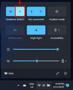 برای شروع، بیایید با مباحث پایهای آشنا شویم. باز کردن و استفاده از پنل Quick Actions نسبتاً ساده است. نقطه دسترسی به Quick Actions در سمت راست نوار وظیفه ویندوز ۱۱ قرار دارد. برای باز کردن پنل Quick Actions، بر روی آیکون باتری، صدا یا اینترنت در نوار وظیفه کلیک کنید. اگر دستگاه شما دارای صفحه لمسی است و نسخه ویندوز ۱۱ 22H2 را اجرا میکنید، می توانید با انگشت خود از این ناحیه به سمت بالا بکشید.