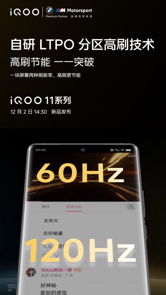 به طور مشابه، iQOO نام تجاری زیر مجموعه Vivo، iQOO 11 را با پنل OLED E6 با وضوح 2K، سیستم LTPO 4.0 120 هرتز، حداکثر روشنایی تا 1800 نیت و سیستم PWM تا 1440 هرتز عرضه می کند. جالب اینجاست که قابلیت هدایت دو بخش مجزا از صفحه نمایش با ریفرشریت متفاوت را دارد. به عنوان مثال، میتواند یک ویدیوی یوتیوب را با فرکانس 60 هرتز در یک بخش و سیستم نظرات را با ریت 120 هرتز برای اسکرول نرمتر اجرا کند. این می تواند سیال بودن رابط کاربری را بهبود و در عین حال عمر باتری را ارتقا بخشد.