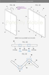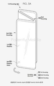 شکلهای ۵A، ۵B، ۵C، ۵D و ۵E از اختراع سامسونگ شامل نمای پرسپکتیو و نمودارهایی هستند که حالت تاشوی نمایشگر گوشی تلفن هوشمند یا تبلت دو لولایی و ۳ پنلی سامسونگ را نشان میدهند.