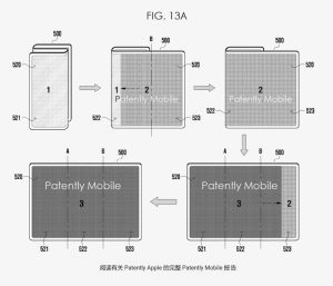 شکل ۱۳A از اختراع اپل، نشاندهنده تغییرات رابط کاربری به دلیل تغییر وضعیت تاشوی نمایشگر یک دستگاه الکترونیک است.