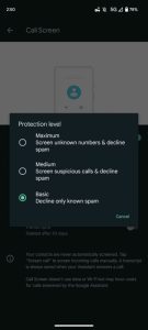 این نسخه بتا اخیرا مورد توجه قرار گرفت و گوگل آن را در اواسط ماه می اعلام کرد. دو جنبه برای این Call Screen بتای وجود دارد، که با “به روز رسانی به تنظیمات UI” شروع می شود. در پایان آن ماه، کاربران شروع به توجه به تنظیمات سادهشده Call Screen کردند. از آن زمان به بعد، گزینههای “سطح حفاظت” جدید گسترش یافتهاند:
