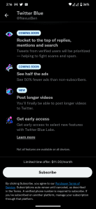 بر این اساس هزینه اشتراک 11 دلار در ماه برای نسخه اندروید، و 8 دلار در ماه از طریق مرورگر وب در نظر گرفته شده است. این تغییر قیمت در نسخهها به دلیل تمایل توییتر به جبران هزینههای خرید درون برنامهای Google Play است.