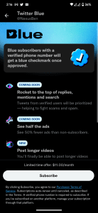 به گزارش تکناک، از 19 ژانویه 2023، گزینه جدید اشتراک توییتر آبی از طریق برنامه رسمی توییتر برای اندروید طبق گزارش و تایید اولیه TechCrunch در دسترس است.