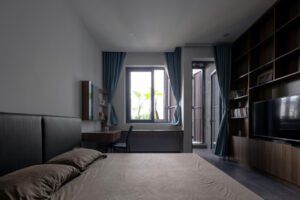 شرکت مشاور طراحی STD توضیح داد: استحکام و سادگی خانه توجه رهگذران را به خود جلب کرده است. نماهای تاشو چوب ساج برای محافظت در برابر آفتاب باز و بسته می شود و تهویه خانه را بهبود می بخشد. نماهای شفاف چوب ساج از تابش مستقیم نور خورشید جلوگیری میکند و در عین حال دید به بیرون را برای ساکنین داخل خانه کاهش نمیدهند.