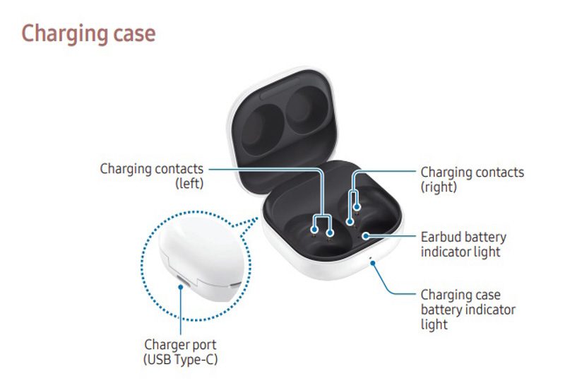 همانطور که در تصاویر زیر می بینید قاب گلکسی بادز اف ای به رنگ سفید معرفی می شود که به این معنی است که این هدفونها در این نوع طیف رنگی موجود خواهد بود.این قاب دارای چراغ های ال ای دی ، نشانگر شارژر و باتری و جایگاه شارژ هدفون و یک فرو رفتگی برای باز کردن قاب است.به نظر می رسد این قاب دارای روکش براقی مثل گلکسی بادز 2 است.در مقایسه با گلکسی بادز 2 پرو این هدفون روکش مات بر روی قاب خود دارد.