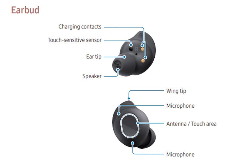 هدفون های Galaxy Buds FE به لطف باله هایشان کمی شبیه به گلکسی بادز پلاس هستند.آنها در مجموع دارای چهار میکروفون هستند یعنی دو عدد در هدفون سمت راست و دو عدد در هدفون سمت چپ و دارای یک سنسور حسگر لمسی و سر گوشی سیلیکونی هستند.هدفون ها با دو سایز و اندازه سر گوشی کوچک/متوسط و متوسط/بزرگ عرضه می شوند.همچنین مشخص نیست که گلکسی بادز اف ای دارای شارژ بی سیم هست یا دارای ویژگی های پیشرفته مثل Seamless Codec HiFi.