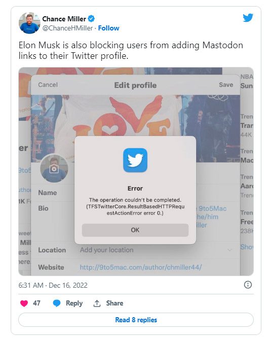 چنس میلر، سردبیر 9to5Mac خاطرنشان کرد که توییتر همچنین لینک های سرویس رقیب Mastodon را مسدود می کند.