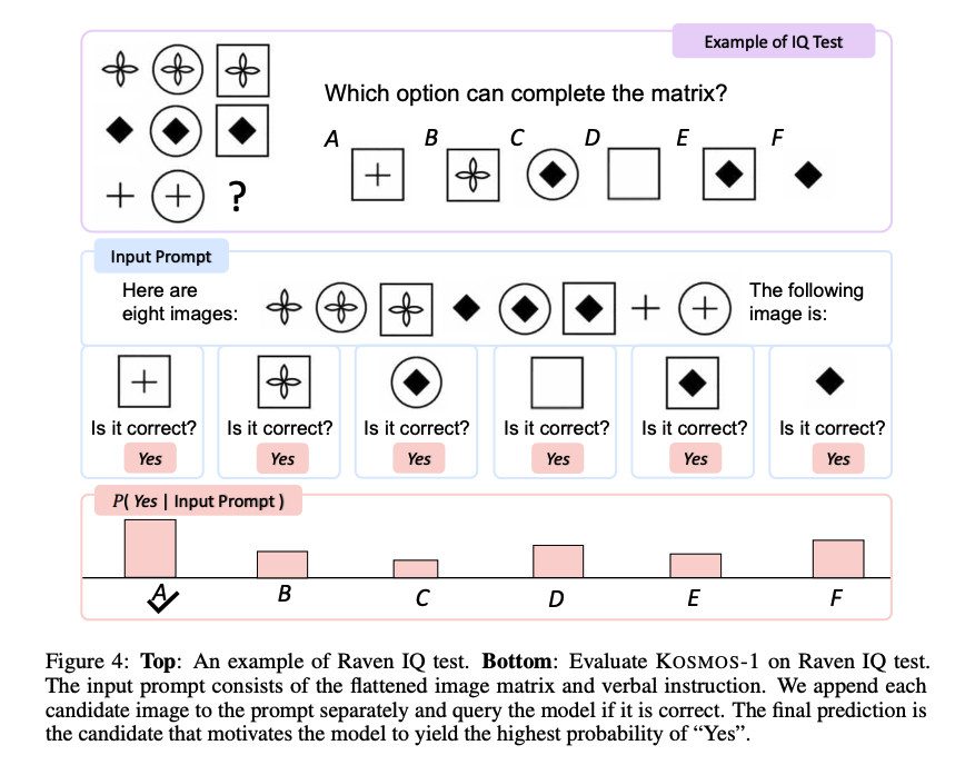 عملکرد Kosmos-1 در حل تست هوش ریون، که با ارائه دنبالهای از اشکال، از آزمون دهنده درخواست می کند تا دنباله را کامل کند، جالب توجه است. برای آزمایش Kosmos-1، محققان یک تست پر شده را یک به یک با هر گزینه تکمیل کردند و از این هوش مصنوعی پرسیدند که آیا پاسخ صحیح است یا خیر. Kosmos-1 فقط در 22 درصد مواقع می توانست به سؤالات در آزمون ریون، پاسخ صحیح دهد. این موفقیت به هیچ وجه شانسی نبود و اشتباهات در پاسخ می توانست بر نتایج تأثیر بگذارد، اما Kosmos-1 از تست هوش ریون هم سربلند بیرون آمد.