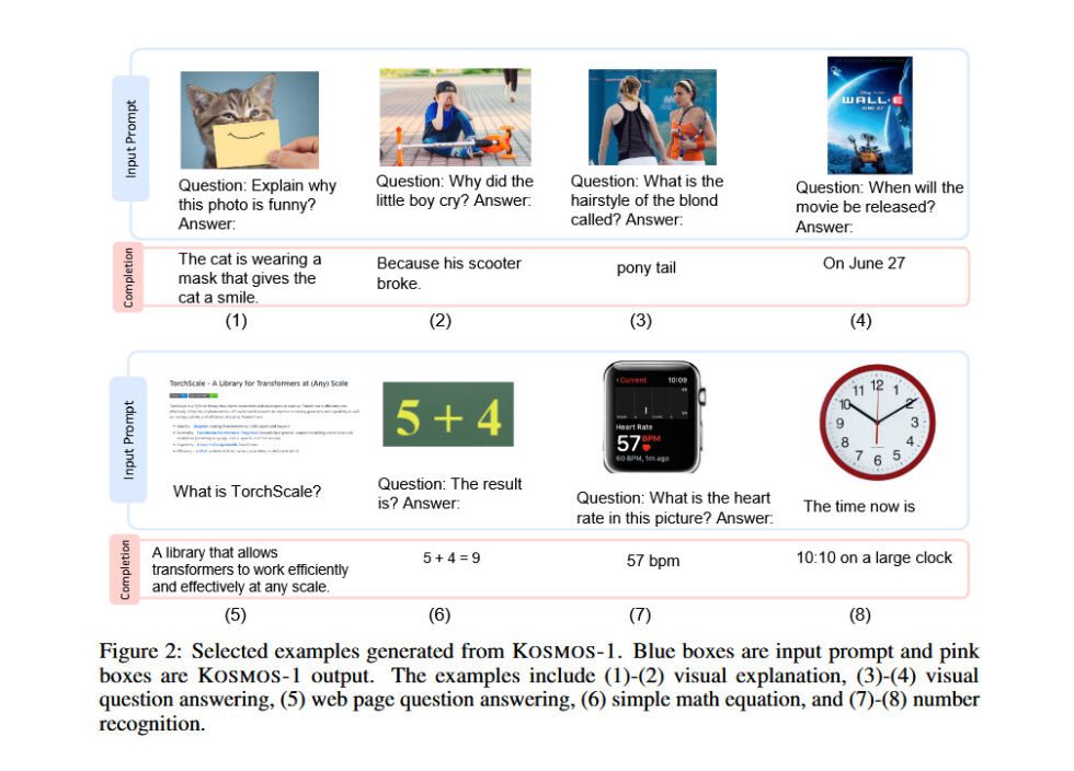 نمونه های تصویری از مقاله منتشر شده در مورد Kosmos-1 نشان می دهد که این هوش مصنوعی تصاویر را تجزیه و تحلیل کرده و به سؤالات مربوط به آن ها پاسخ می دهد. همچنین، متن را از یک تصویر می خواند، شرح عکس ها را می نویسد و تست هوش بصری را با دقت 22 تا 26 درصد انجام می دهد.