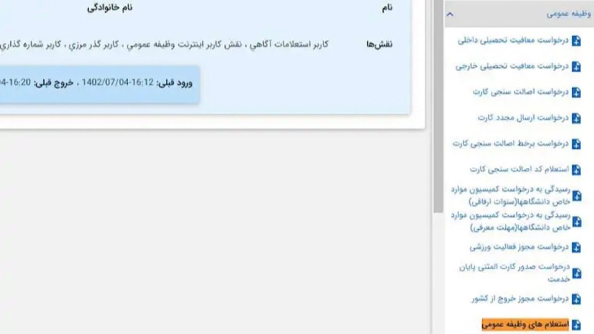 - در بخش وظیفه عمومی، به قسمت درخواستها یا استعلام وضعیت کارت پایان خدمت بروید.