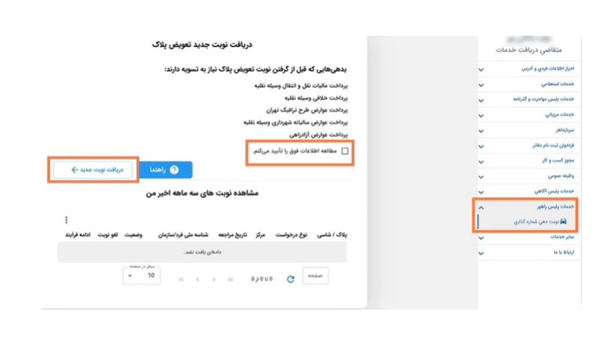 - برای نوبتدهی تعویض پلاک، به بخش خدمات پلیس راهور و سپس سامانه نوبتدهی تعویض پلاک خودرو بروید.