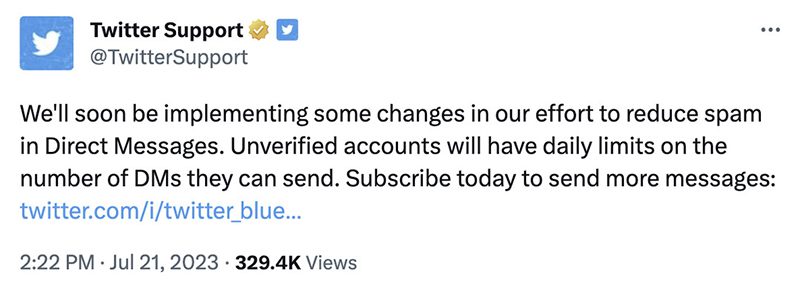 توییتر اعلام کرد به زودی برای حسابهای تأیید نشده محدودیتهای روزانه در تعداد پیامهای مستقیم ارسالی به منظور کاهش پیام های اسپم اعمال میکند. به عبارت دیگر، برای ارسال DM نامحدود، باید اشتراک توییتر بلو تهیه کرد.