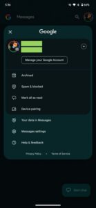 تغییر بزرگ این است که برنامه Google Messages دیگر از نوار ناوبری استفاده نمیکند که به بهبود ظاهر اپلیکیشن کمک میکند. به جای آن، میتوانید با لمس تصویر نمایه پروفایل خود در گوشه بالا و سمت راست، بخش های Archived، Spam & blocked، Mark as all read و Device pairing را پیدا کنید. یک حباب سریع توضیح میدهد که این موارد حالا “در یک مکان” همراه تنظیمات برنامه قرار دارند.