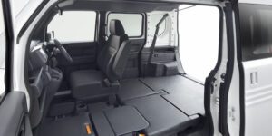 هوندا N-Van e ستون وسط سمت سرنشین را برای بارگیری و تخلیه بدون زحمت حذف می کند. این EV دارای برد 130 مایلی (210 کیلومتری) است بنابراین میتواند قبل از نیاز به شارژ مجدد، تحویل کامل محموله های خود در شهر را انجام دهد. این خودرو دارای حالت ECON است که مصرف انرژی کولر گازی را کاهش می دهد تا برد را افزایش دهد.