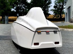 خوب، این معمولاً یک سه چرخه دراز کشیده یا در مواردی مانند این، یک چهار چرخه است که در یک پوسته کامل آیرودینامیکی پوشانده شده است. این بدنه ساده باعث می شود وسیله نقلیه سریعتر از یک دوچرخه ایستاده باشد به علاوه فضای مناسبی برای بار همراه با محافظت در برابر آب و هوای نامساعد فراهم کند.