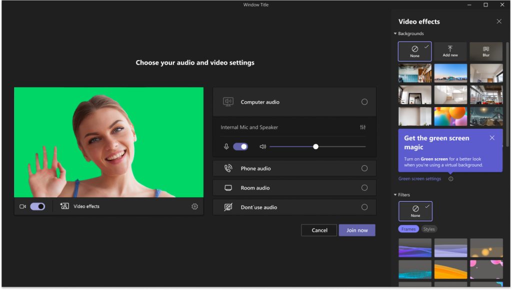 - پس از باز شدن پنل «Video effects»، به «Green Screen Settings» در بخش Backgrounds بروید و روی پیوند کلیک کنید تا دکمه صفحه سبز در زیر «Teams settings -> Devices -> Green screen» روشن شود.