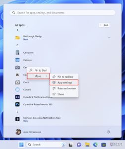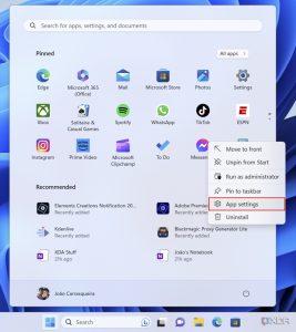 • ابتدا منوی Start را باز کنید. اگر برنامه مورد نظر شما در آیکون‌های پین شده وجود دارد، روی آیکون آن راست کلیک کرده و گزینه App settings را انتخاب کنید. اگر در لیست برنامه‌ها وجود ندارد، روی دکمه All apps کلیک کنید و برنامه را از لیست پیدا کنید. سپس روی آن راست کلیک کرده و گزینه More > App settings را انتخاب کنید.