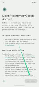 - صفحه بعدی شامل توضیحاتی درباره نحوه استفاده گوگل از دادههای Fitbit است. برای پذیرش شرایط و انتقال دادهها، گزینه Agree & move را فشار دهید.