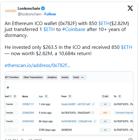 یک کیف پول بلاکچینی که در عرضه اولیه اتریوم در سال ۲۰۱۵ شرکت کرده و بیش از یک دهه بدون فعالیت مانده بود، ناگهان فعال شده و سودی خارقالعاده معادل ۱۰٬۶۸۴ برابر به دست آورده است.