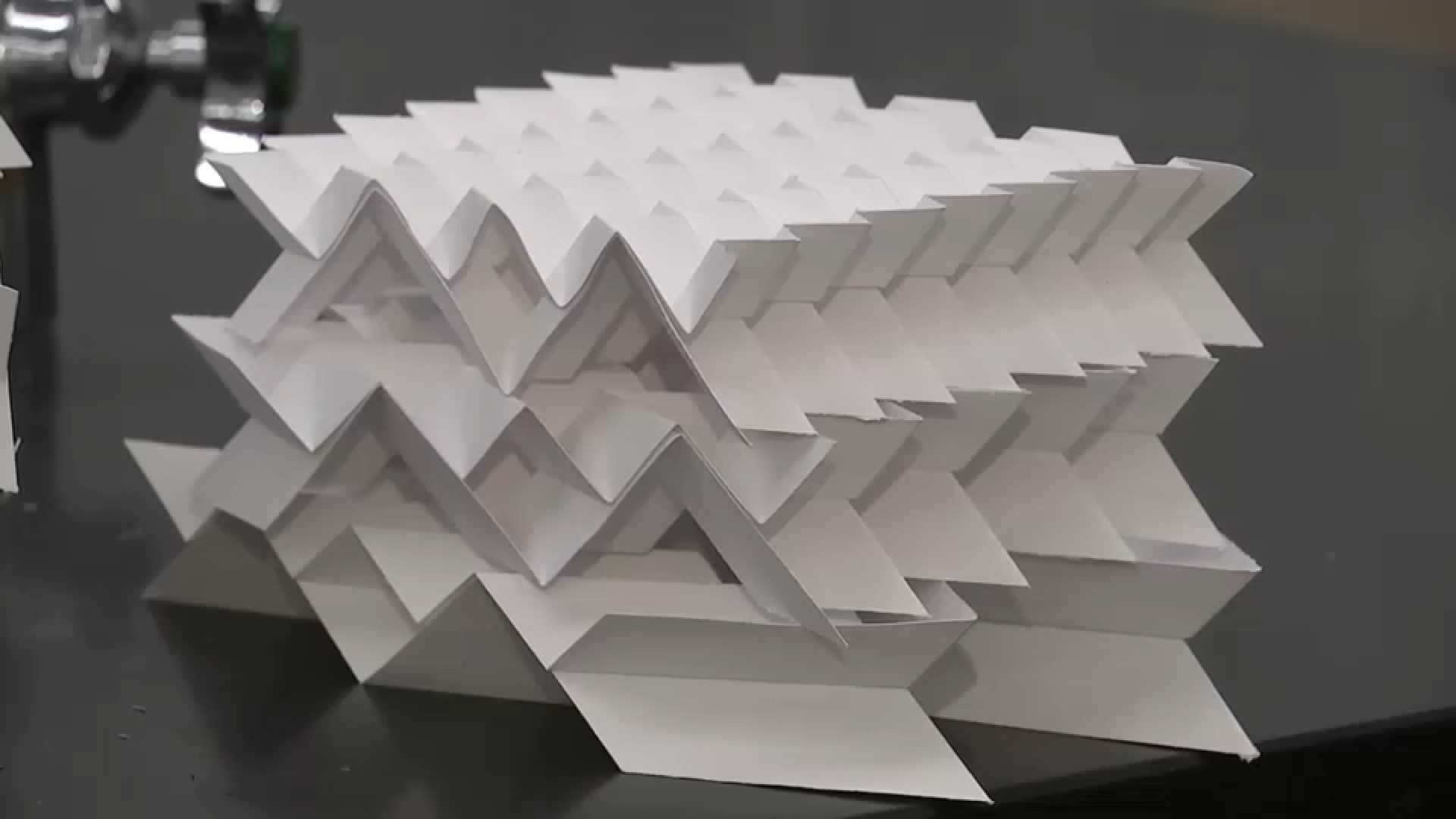 وو برای اندازه‌گیری مقاومت هر نمونه از اوریگامی میورا-اوری خود، روی آنها وزنه گذاشت.