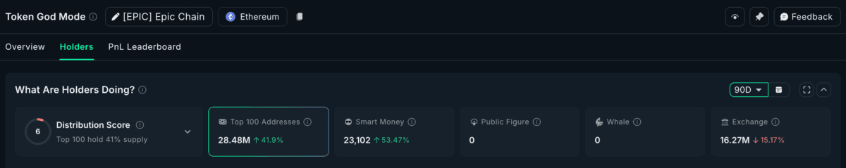 میزان نگهداری اپیک توسط سرمایه‌گذاران هوشمند در سه ماه گذشته بیش از ۵۳.۴۷٪ افزایش یافته است، در حالی که موجودی صرافی‌ها ۱۵.۱۷٪ کاهش یافته است. این نشانه‌ای از کمبود عرضه و افزایش تمایل هولدرها به ذخیره بلندمدت یا استفاده کاربردی از توکن است. حتی ۱۰۰ آدرس برتر نیز بیش از ۱۲ میلیون توکن دیگر به دارایی‌های خود اضافه کرده‌اند.