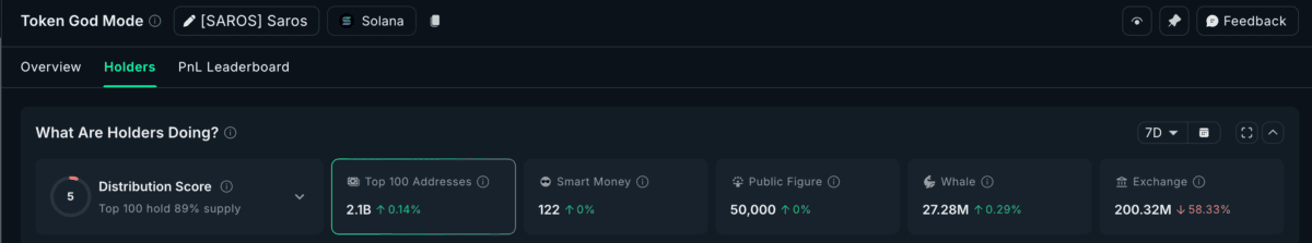 در هفته گذشته، نهنگ‌ها ۰.۲۹٪ بیشتر به دارایی‌های ساروس خود افزودند. مهم‌تر از آن، موجودی این توکن در صرافی‌ها بیش از ۵۸.۳۳٪ کاهش یافته است که نشانه‌ای قدرتمند از هولد و احتمال استفاده کاربردی است.