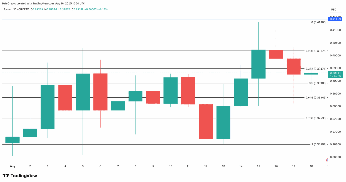 ساروس هم‌اکنون در سطح ۰.۳۹ دلار معامله می‌شود که تنها ۵٪ کمتر از اوج تاریخی ۰.۴۱ دلار است. نمودار روزانه نشان می‌دهد که قیمت در حال تثبیت زیر مقاومت ۰.۳۹ دلار است. عبور و تثبیت بالای ۰.۴۰ و سپس ۰.۴۱ دلار می‌تواند مسیر کشف قیمت را باز کند. اما افت به زیر سطح ۰.۳۷ دلار، ساختار صعودی کوتاه‌مدت را تضعیف خواهد کرد.