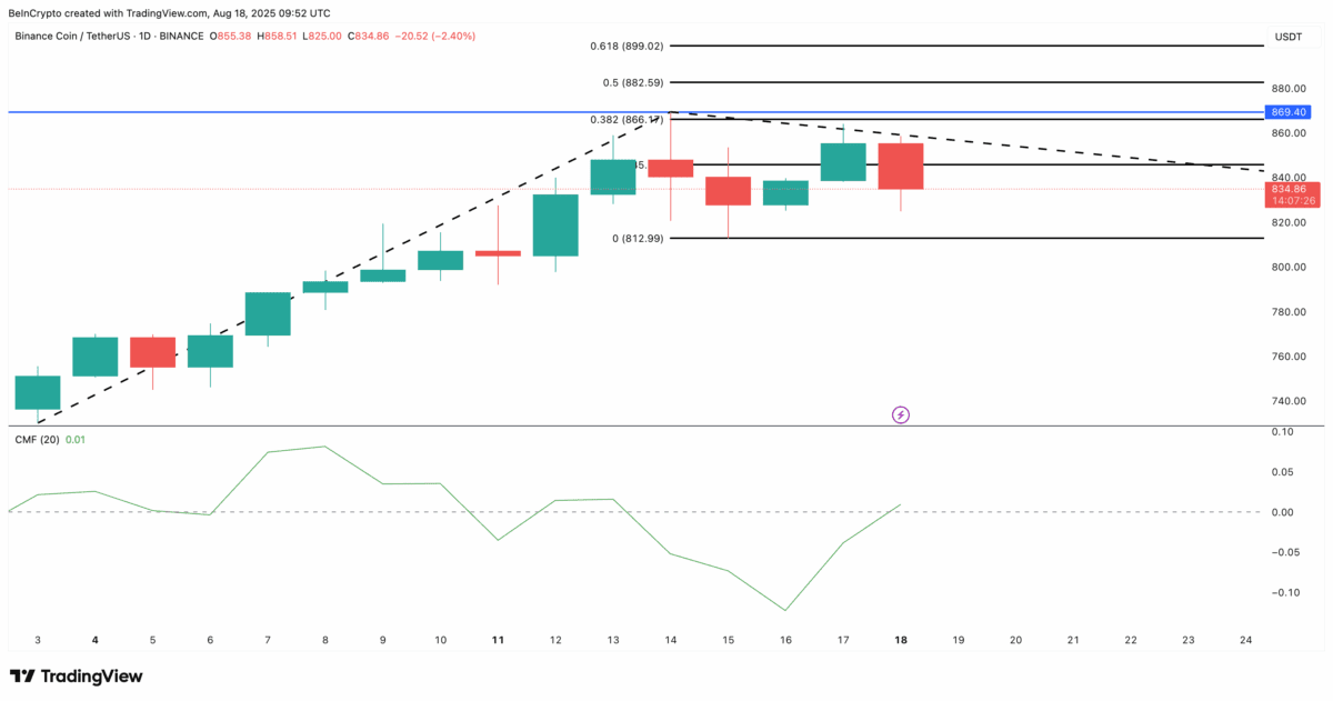 در حال حاضر بایننس کوین حدود ۸۳۴ دلار معامله می‌شود و حمایت مهم آن کمی بالاتر از ۸۱۲ دلار قرار دارد. از دست دادن این حمایت می‌تواند رؤیای اوج تاریخی را تضعیف کند. از سوی دیگر، شاخص جریان پول چایکین (CMF) در محدوده مثبت ۰.۰۱ است که بیانگر ورود سرمایه متوسط به بازار است. عبور از ۰.۰۲ می‌تواند تأییدکننده شروع یک فاز قوی انباشت باشد.