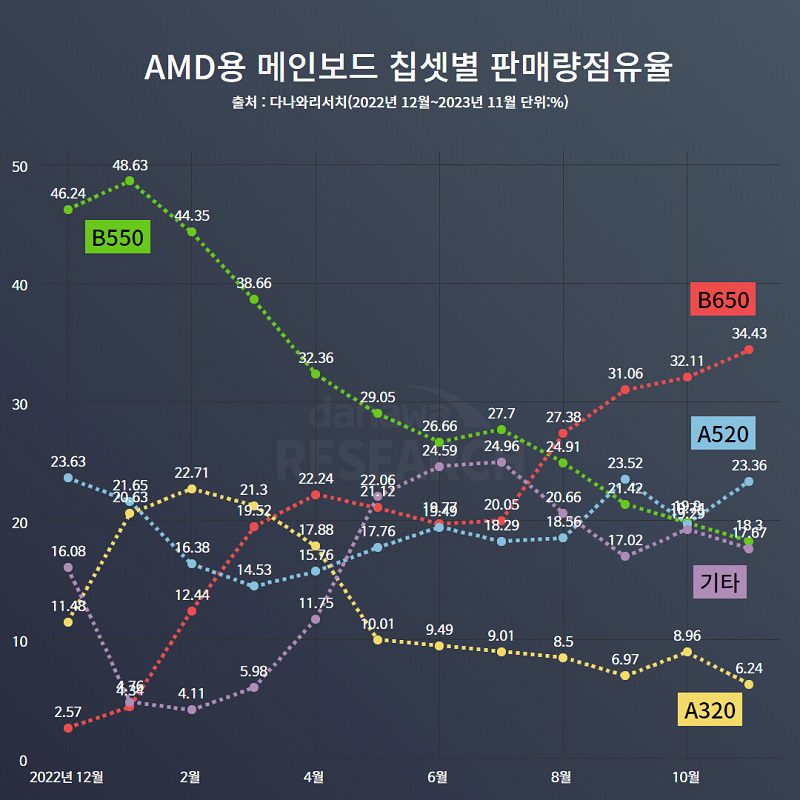 درحالحاضر، مادربردهای B650 (AM5) ایامدی ۳۴/۴۳ درصد از سهم بازار فروش در کرهجنوبی را تشکیل میدهند. مادربردهای A520 (AM4) با ۲۳.۲۶ درصد و B550 (AM4) با ۱۸.۳ درصد و سایر مادربردها با ۱۷.۶۷ درصد ردههای بعدی را دراختیار دارند.