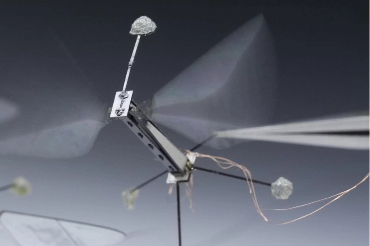 نمونهٔ آزمایشگاهی یک ربات پرندهٔ هم‌اندازهٔ حشره که با بال‌های نازک و سامانهٔ الکترونیکی سبک، حرکت و تعادل را شبیه‌سازی می‌کند.