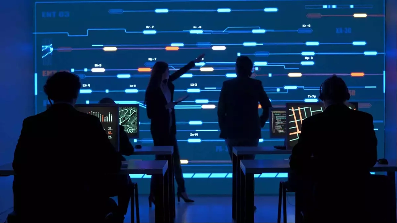 کارشناسان فناوری ، داده‌های کاربران را در یک مرکز نظارتی دیجیتال ، تحلیل می‌کنند.