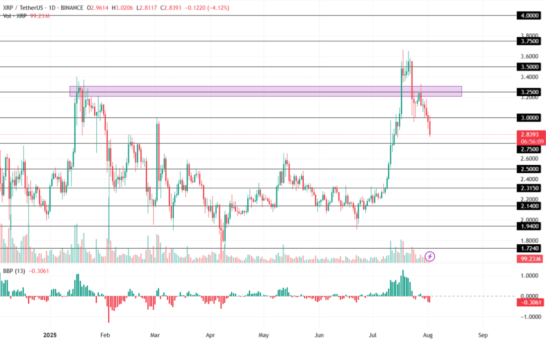 ریپل (XRP) در مقایسه با BTC و ETH نوسانات شدیدتری را تجربه کرده است. قیمت فعلی XRP حدود ۲.۸۵ دلار است که نسبت به روز قبل تقریباً ۵٪ کاهش داشته است. این در حالی است که طی یک ماه گذشته، XRP بیش از ۲۵٪ رشد کرده بود و تا ۳.۸۴ دلار نیز صعود کرده بود.