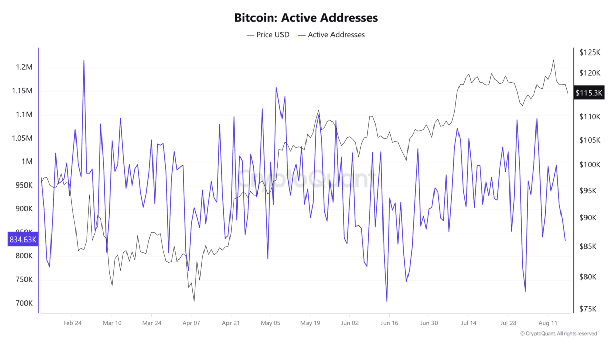 بر اساس داده‌های کریپتوکوانت، شمار آدرس‌های فعال در ۱۴ آگوست به اوج ۹۹۴,۲۸۸ رسید، اما تنها طی چهار روز معاملاتی بیش از ۱۶۰ هزار مورد کاهش یافت.