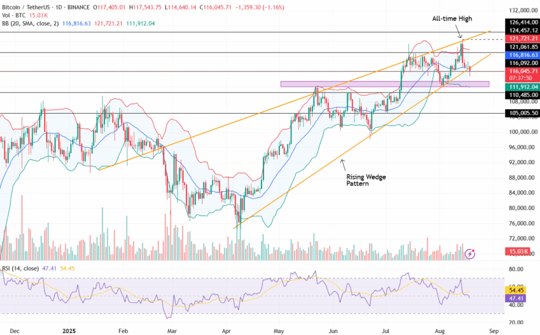 نمودار بیت کوین در تایم‌فریم روزانه یک الگوی کنج صعودی را نشان می‌دهد؛ الگویی که معمولاً از کاهش قدرت صعودی حکایت دارد. بیت کوین پس از رسیدن به اوج ۱۲۴ هزار دلاری با فشار فروش مواجه شد و اکنون در حال بازآزمایی حمایت ۱۱۵ هزار دلاری است.