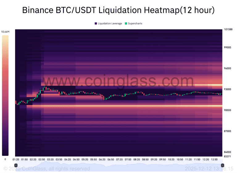 در ۱۲ ساعت گذشته، قیمت بیتکوین عمدتاً در محدودهای باریک حوالی ۹۳٬۰۰۰ دلار حبس شده است، در حالی که خوشههای بزرگ نقدینگی در دو سوی قیمت شکل گرفتهاند. بر اساس دادههای لیکوئیدیشن، بیتکوین عملاً در مرکز یک «ساندویچ نقدینگی» قرار دارد؛ ساختاری که در آن قیمت میان دو آهنربای بزرگ لیکوئیدیشن گیر میافتد.