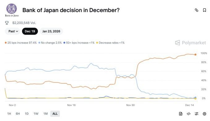 بانک مرکزی ژاپن قرار است در ۱۹ دسامبر نشست مهم سیاستگذاری خود را برگزار کند و انتظار میرود نرخ بهره را ۲۵ واحد پایه افزایش دهد. حتی پلتفرم پیشبینی پالیمارکت نیز احتمال این افزایش را ۹۸ درصد نشان میدهد. برخی کارشناسان پا را فراتر گذاشته و احتمال میدهند این افزایش تا ۷۵ واحد پایه هم برسد.