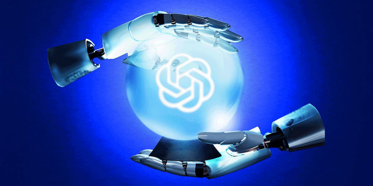 دستان رباتیک که یک گوی کریستالی درخشان آبی‌رنگ را نگه داشته‌اند و لوگوی ChatGPT درون آن می‌درخشد.
