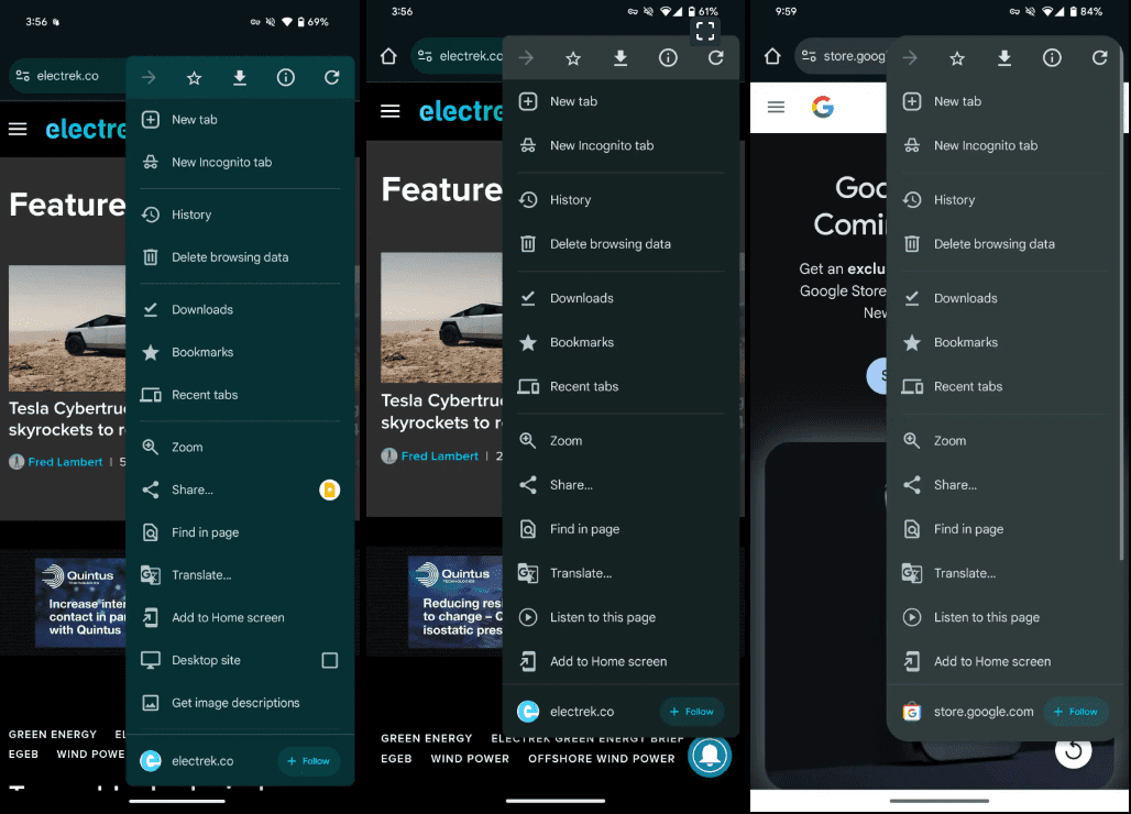 همچنین، گوگل تغییراتی در رنگ پویا (Dynamic Color) برای حالت تاریک اعمال کرده است. درحالی‌که نسخه ۱۳۶ این ویژگی را تیره‌تر و کم‌زنده‌تر کرده بود، کروم ۱۳۹ برای اندروید رنگ‌ها را روشن‌تر و نزدیک‌تر به خاکستری و جداسازی بین ردیف بالای عملیات و بخش نخست منو سه‌نقطه را حذف کرده است. این تغییر در سراسر محیط گرافیکی مرورگر اعمال می‌شود.