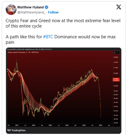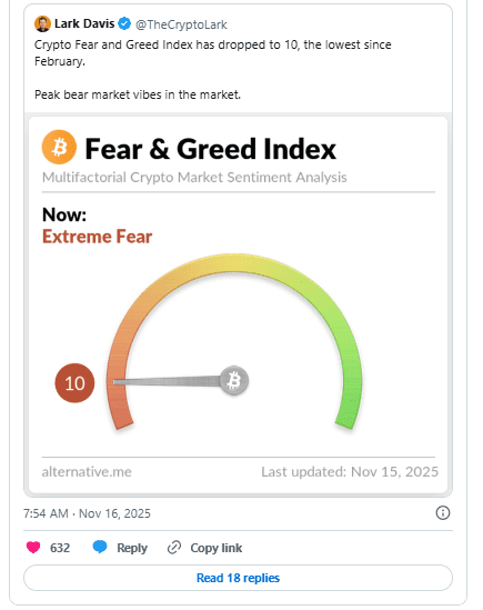 چانگپنگ ژائو این هفته قصد نداشت جو بازار را مثبت جلوه دهد. او در شبکه اجتماعی X نوشت: «نظر غیرمحبوب، اما بهتر است زمانی بفروشید که طمع در بیشترین حد است و زمانی بخرید که ترس در بیشترین حد باشد.» این قانون در دنیای رمزارز آشناست، اما زمانی اهمیت بیشتری پیدا میکند که بازار حدود سه هفته در شدیدترین حالت ترس قفل شده باشد.