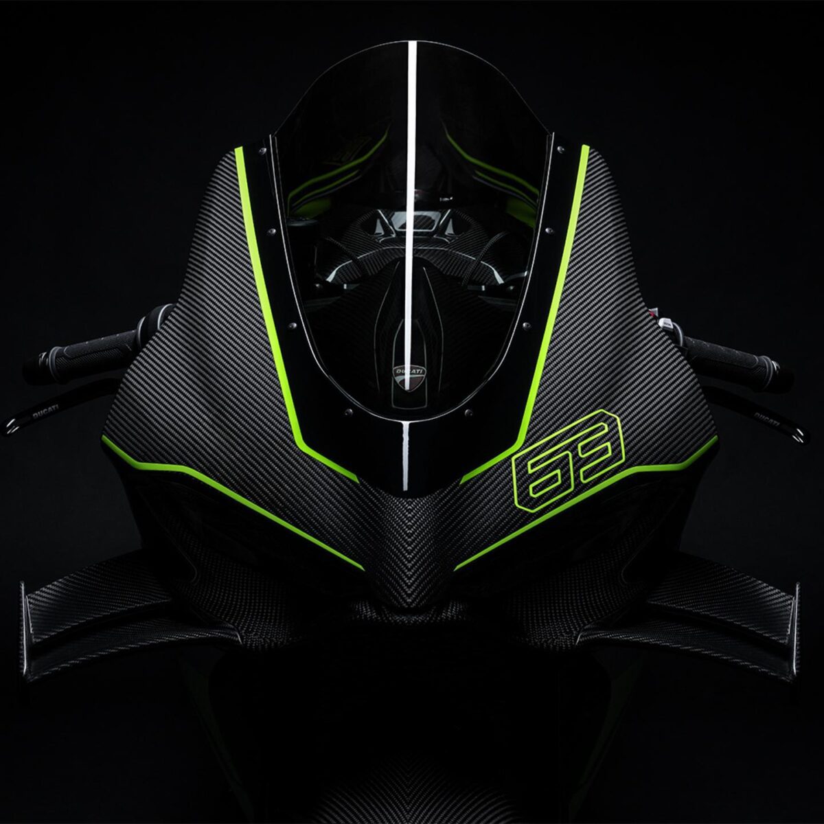 شماره مدل موتورسیکلت روی سهگیره حک شده است و عبارت “Desmosedici Stradale” نیز روی پلاک موتور دیده میشود. همچنین گارد پاشنه، محافظ حرارتی و گلگیرها، همگی از فیبر کربن با الگوی خاص بهکاررفته در خودروهای Lamborghini تولید شدهاند.