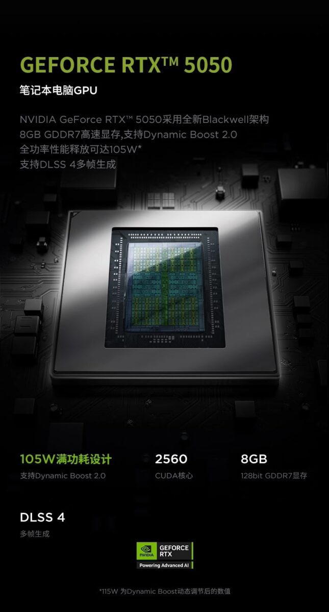 GeForce RTX 5050 بر پایه چیپ GB207 توسعه یافته و دارای ۲۵۶۰ هسته CUDA است. این کارت از حافظه ۸ گیگابایت GDDR7 بهره میبرد و از گذرگاه حافظه ۱۲۸ بیتی استفاده میکند که پهنای باند آن را به ۳۸۴ گیگابایت بر ثانیه میرساند. توان حرارتی این مدل نیز ۱۱۵ وات اعلام شده که مشابه RTX 5060 لپتاپ است.