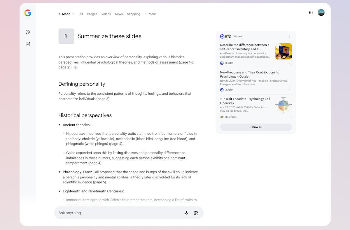 به‌روزرسانی AI Mode گوگل قابلیت‌هایی همچون تحلیل بصری و پردازش فایل‌های PDF و پاسخ‌گویی به محتوای صفحات وب را به این ابزار هوش مصنوعی افزوده است.