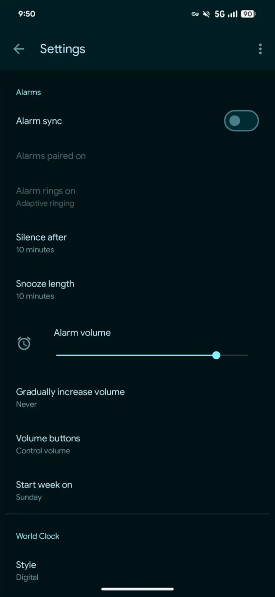همچنین در منوی تنظیمات، تغییر کوچکی در ترتیب گزینهها اعمال شده است. اکنون گزینه Alarms در صدر فهرست قرار دارد و “World Clock” در جایگاه دوم، مطابق با ترتیب نوار پایین صفحه دیده میشود. گزینههای Timers و Screen saver نیز انتهای فهرست را تشکیل میدهند.