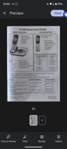 - هنگامی که سند اسکن شد، به صفحه پیشنمایش میروید، جایی که میتوانید اسکن را بررسی کنید، آن را برش دهید و بچرخانید، از انواع فیلترها استفاده کنید، آن را دوباره ثبت کنید یا حذف کنید. همچنین می توانید با ضربه زدن روی علامت مثبت در کنار تصویر کوچک اسکن، صفحات دیگری را به PDF اضافه کنید. وقتی کار شما تمام شد، روی Done در سمت راست بالای صفحه ضربه بزنید.